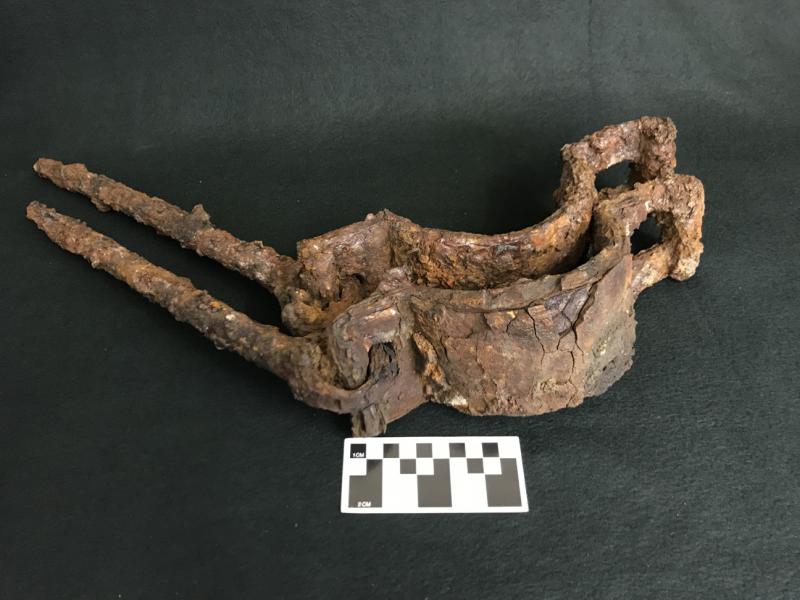 The rectangular caps measure 7.8cm (3") in width, 28.5cm (11¼") in length, and were nested together in a parallel arrangement. Attached through an opening in each is a 32cm (12") long pin measuring ¾"/2.1cm in diameter. These were used attach the hardware to a gun carriage. Internal diameter of the half-round brackets is 13.2cm (5¼"). Both caps / brackets exhibit localized slag-like concretions that suggest that the hardware was removed from the carriage by fire. During one early salvage expedition Shalkop (1979:42) reported "the waves were once so strong they even cast up two carronades." This hardware indicates that at least one cannon was successfully recovered from the site.